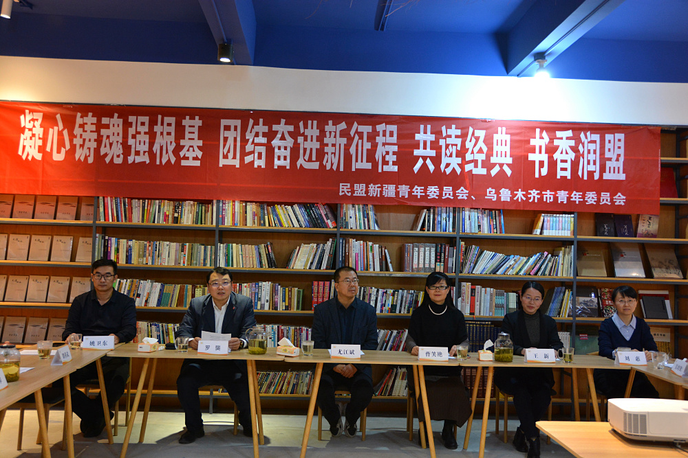 2023年12月8日下午,民盟新疆青年工作委员会、乌鲁木齐市青年工作委员会“凝心铸魂强根基 团结奋进新征程”主题教育座谈会暨“共读经典·书香润盟 ”读书会在乌鲁木齐迪化书店召开。民盟新疆区委会专职副主委尤江斌、副主委吴顺华、秘书长曹笑艳、组织部副部长刘惠、宣传部副部长白玉,民盟乌鲁木齐市专职副主委、秘书长王新、以及民盟新疆青年工作委员会、乌鲁木齐市青年工作委员会委员等参加主题教育座谈会。会议由民盟新疆青年工作委员会主任罗龑主持。