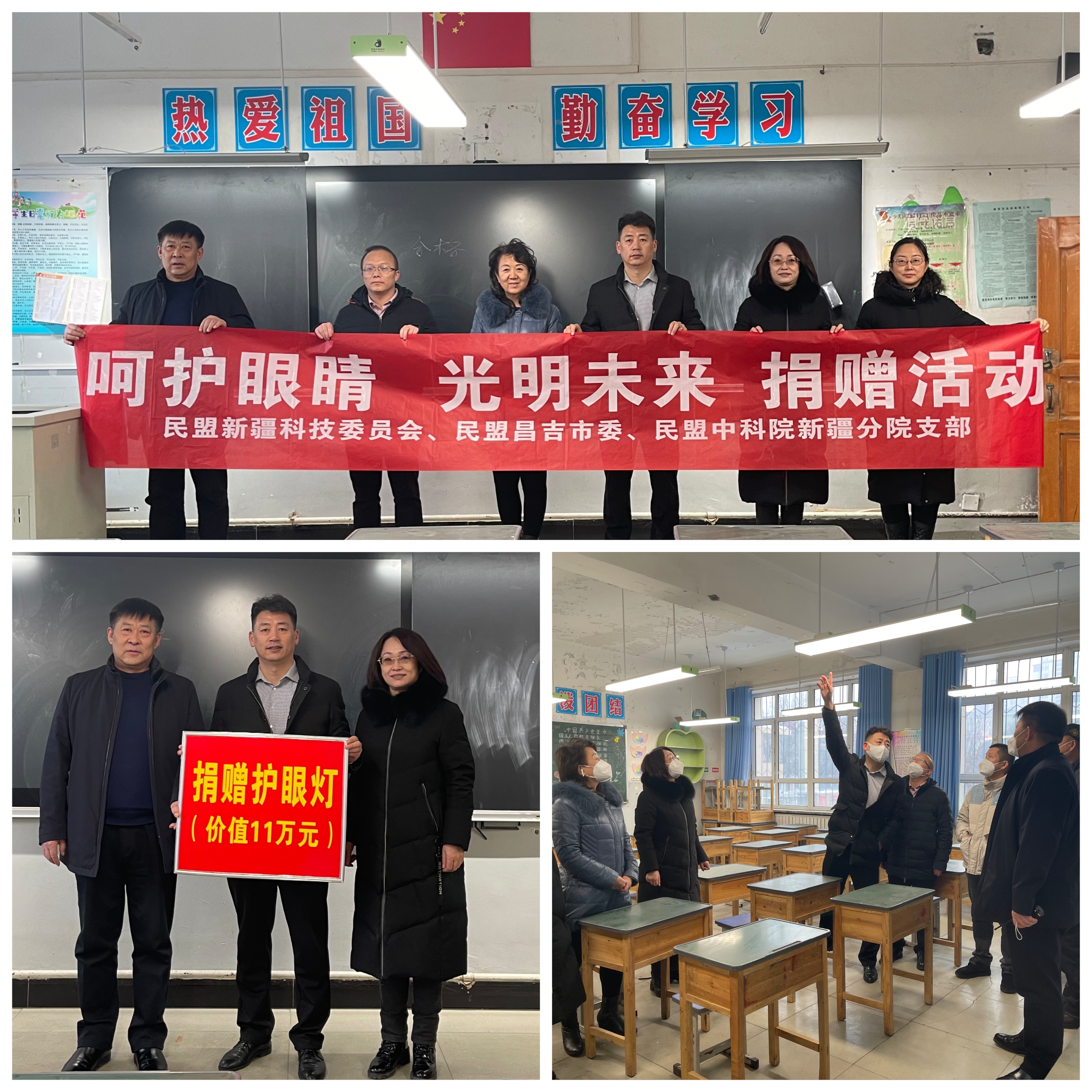 捐赠活动中,民盟新疆科技委员会主任李卫红首先代表新疆民盟做了讲话,表达了民盟人时刻关注教育、关注孩子未来健康发展的心愿,并提前送去了新春节日的祝福。之后,此次活动的实际捐赠者张小成副主委,给大家详细介绍了护眼灯的功能、安装和使用方法。徐长春副主委和第三中学领导进行了交流,了解了学校目前存在的困难和问题。对于此次迎新春、送温暖、献爱心行为,昌吉市第三中学高成军书记表达了深深的谢意,并感慨地说:“此次护眼灯捐赠可谓是雪中送炭,极大地改善了学校教室原有的照明环境,为孩子们送来了光明,送来了希望”。在充分了解了该校学生构成与存在的主要问题后,各位委员都纷纷表示要进一步加强合作、帮助弱势群体,给学校提供更多的科教支持。昌吉市第三小学蒋晓勇书记对此次捐赠活动也表达了由衷的感谢,双方在交换了意见后,委员们表示今后要充分发挥民盟科技委员会以及各个支部的力量,为孩子们牵线搭桥,建立各种校外学习平台,扩大视野,提升认知。青少年儿童是祖国的未来,民族的希望,不仅要有扎实的学识功底,更要有强健的体魄和明亮的双眼,保护孩子视力健康是国家大事。此次“呵护眼睛,光明未来”捐赠活动不仅践行了党的二十大精神,弘扬了社会主义核心价值观,更充分体现了民盟人心系祖国、情系民生、服务社会、始终关注下一代健康发展的强烈社会责任和担当。