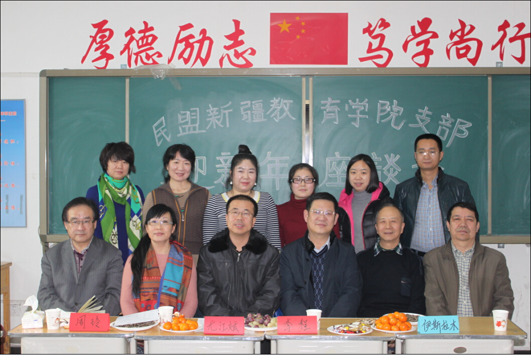 2015年1月8日下午,民盟新疆教育学院支部召开迎新年座谈会,新疆教育学院党委书记李程、民盟新疆区委会专职副主委尤江斌、新疆教育学院统战部部长伊斯拉木、民盟新疆区委会组织部部长周玲、民盟新疆区委会组织部干事庞军应邀出席了此次座谈会。